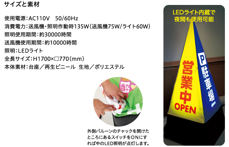 使用電源:AC110V 50/60Hz 消費電力:送風機・照明作動時135W (送風機75W/ライト60W) 照明使用期間:約30000時間 送風機使用期間:約10000時間 照明:LEDライト 全長サイズ:H1700×□770(mm) 本体素材:台座/再生ビニール 生地/ポリエステル